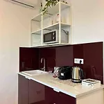 В апартаментах передбачена повністю обладнана кухня з мікрохвильовою піччю і холодильником, а також кавоваркою. Апартаменти розташовані одразу біля автобусної зупинки A.